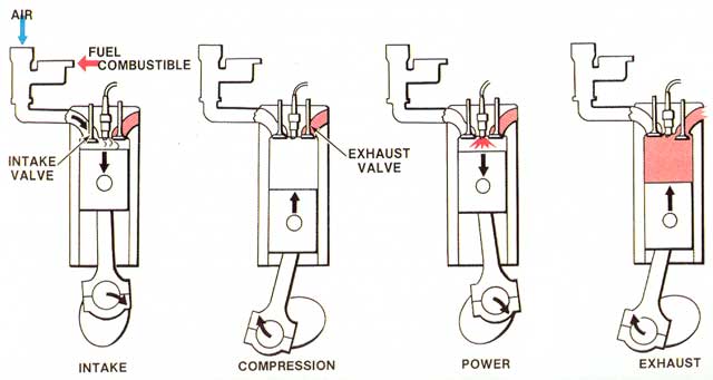 A four-cycle engine requires four strokes of the piston (two up and two down) and two revolutions of the crankshaft to complete one combustion cycle and provide one power impulse. |